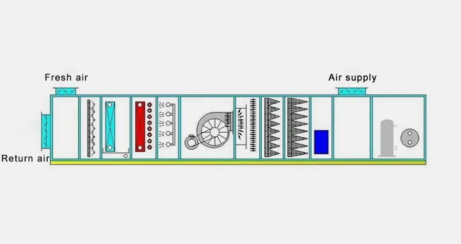 L'air neuf traité par l'unité de traitement d'air (UAM) est mélangé à une partie de l'air repris, filtré par le FFU et envoyé vers la salle blanche. Après refroidissement ou réchauffement par la batterie sèche, l'air intérieur est renvoyé vers le canal de reprise et mélangé à l'air neuf supplémentaire pour former un système de circulation d'air en boucle fermée.